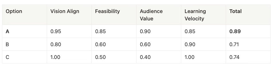 Weights: Vision alignment (0.35), Feasibility (0.25), Audience value (0.20), Learning velocity (0.20)
