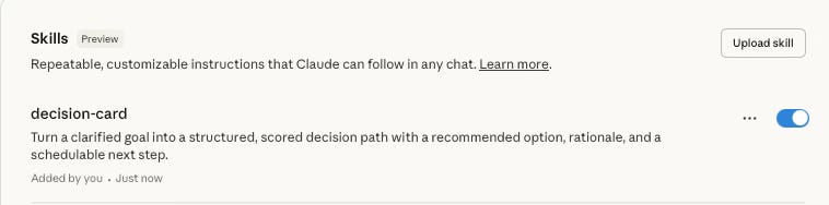 Now you can see that Claude is actually running two skills in sequence—the Intention Clarifier from Lesson 1 and the Decision Card—in a chain!