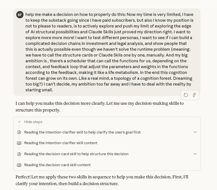 help me make a decision on how to properly do this: Now my time is very limited, I have to keep the substack going since I have paid subscribers, but also I know my position is not to please to readers, is to actively explore and push my limit of exploring the edge of AI structural possibilities and Claude Skills just proved my direction right. I want to explore more more more! I want to test different personas, I want to see if I can build a complicated decision chains in investment and legal analysis, and show people that this is actually possible even though we haven’t solve the runtime problem (meaning: we have to call the structure cards or Claude Skils one by one, manually. And my big ambition is , there’s a scheduler that can call the functions for us, depending on the context, and feedback loop that adjust the parameters and weights in the functions according to the feedback, making it like a life metabolism. In the end this cognition forest can grow on its own. Like a real mind, a topology of a cognition forest. Dreaming too big?) I can’t decide, my ambition too far away and I have to deal with the reality by starting small.