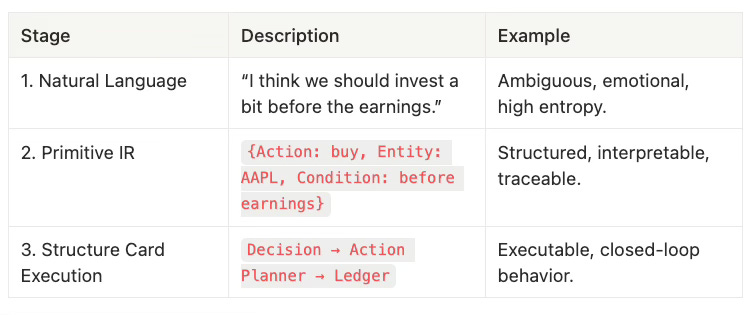 By converting your high-entropy language (vague, emotional, ambiguous) into low-entropy structures (Primitive IR), you create a contract of meaning — one that an agent can read, verify, and execute with absolute fidelity.