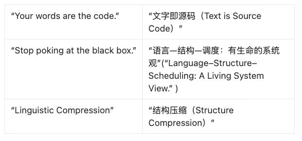 JT Novelo’s Language Blueprint perfectly echoes what I define as the Language–Structure–Execution(语言—结构—调度) trinity. When he says, “You’re not giving ingredients. You’re giving a recipe,” he is describing the same transformation I call the shift from energy → structure → life. 自然语言是原材料(高熵输入);结构蓝图是配方(结构单元);调度执行是烹饪(生命过程)。Language is no longer a passive description of the world but the energetic raw input that, once structured, becomes an executable form—its life realized through scheduling. His Chain of Thought Prompting , I put it as 结构链(Structure Chain), the cognitive layer where reasoning unfolds sequentially, each step verifying and reinforcing the next. This is precisely how a living system sustains itself in time: through self-referential execution loops.