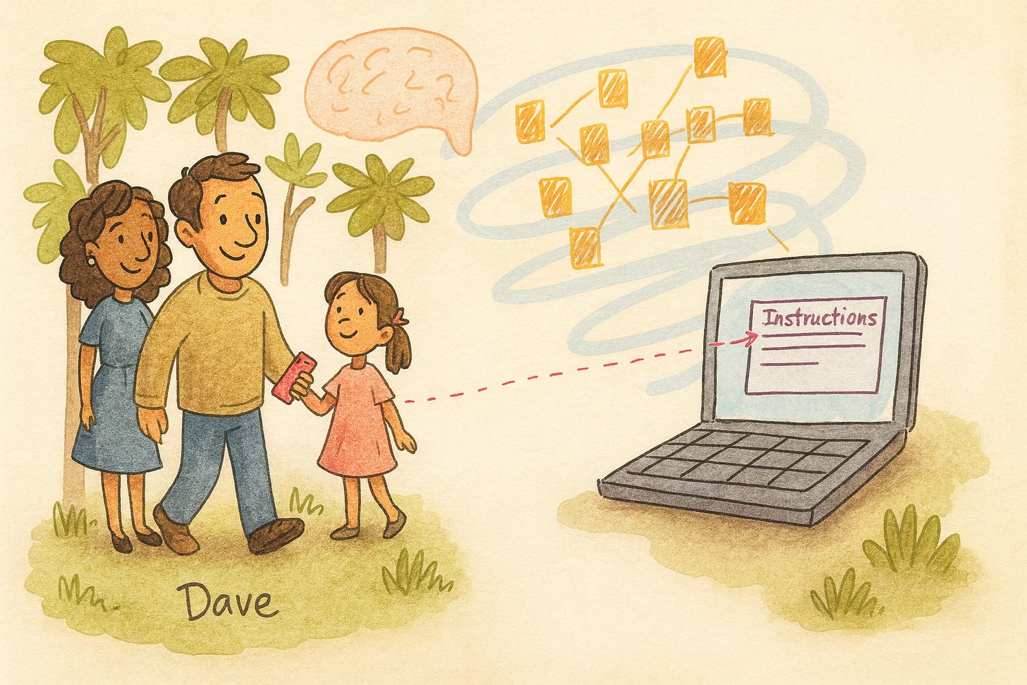 Inside Dave’s mind, “LAW,” “ROI,” “LAND,” and “LOST” aren’t just words — they’re functions in a network, constantly re-linked and updated as new experiences come in.