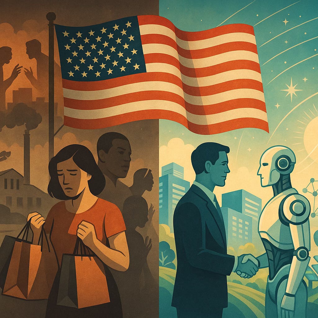 This sets up the new battle line: not left vs. right, not Democrat vs. Republican, but past vs. future. One side clings to the broken myths of yesterday, trying to resuscitate stories that no longer inspire belief. The other seeks to imagine a story large enough to encompass exponential change — a story where humans and intelligence evolve together to forge a shared future of abundance.