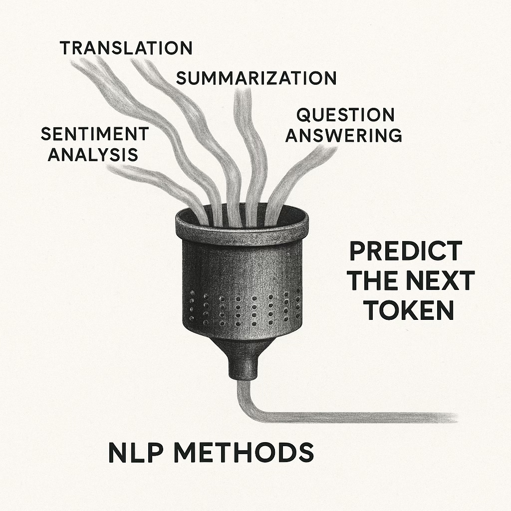 The breakthrough of large language models is almost embarrassingly simple. Instead of designing a new system for each linguistic task, researchers discovered that every task could be reframed as a single act: predicting the next token.