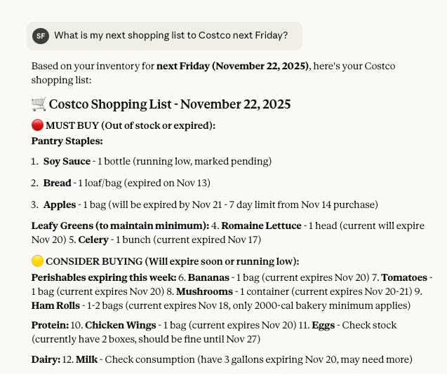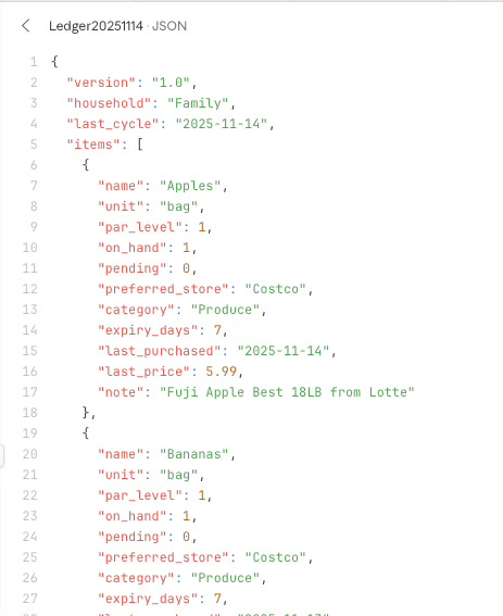 Every sentence you give to the Shopping Skill is not just input; it is training your household model. Traditional bookkeeping is a static record: “Two bottles of milk, $3.99.” AI-Native bookkeeping is structural: “This is our family’s replenishment rhythm; this is our inventory logic; this is our waste pattern; this is our budgeting structure.” Every time you say, “Add what I just bought,” or “What did we buy this week?”, or “Change the oat milk par to 3,” or “What’s about to expire?”, the system is not memorizing what you have—it is learning how your household operates.