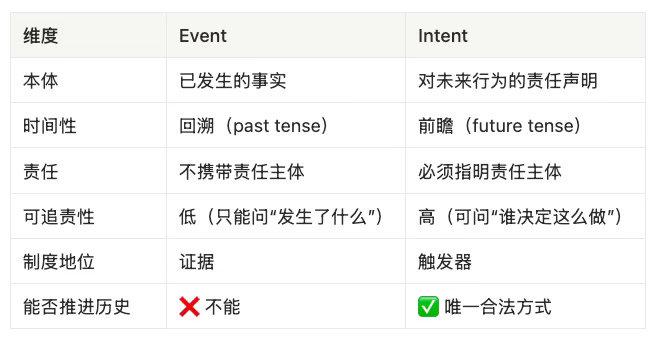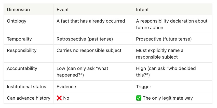 Intent is an institutional statement: it upgrades “I want to do this” into “I am willing to take responsibility for advancing history,” explicitly specifying the responsible subject, scope, risk acceptance, rollback plan, and so on.