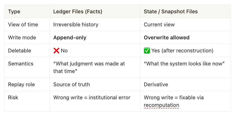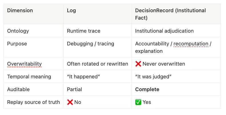 The advancement of system history can be triggered only by responsible subjects; institutional judgments are recomputable; side effects are traceable; failures do not evaporate.