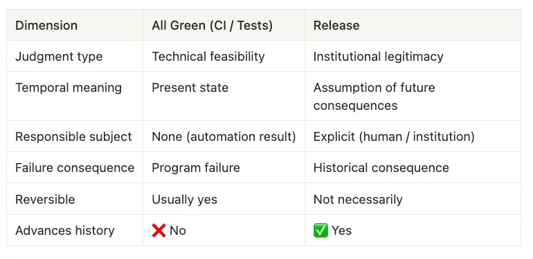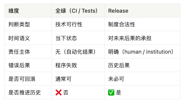 evidencefield or act as optional policy inputs, but must never become triggers.“All green” is not a prerequisite for release; at most, it is one execution condition, not a justification for advancing history.