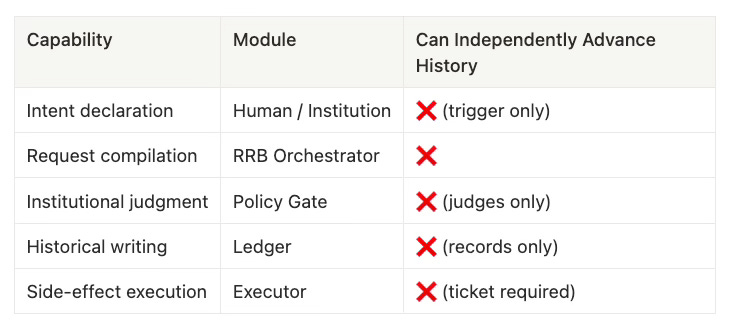 这四条不是“建议”,而是 RRB 之所以能活十年 的可证明约束:它们把“模型的不确定性”关在 Proposal 区,把“系统的主权写入”锁进 Deterministic 区,把“副作用”锁进 Ticket 区。任何一条被破坏,RRB 就会退化成普通 CI/CD:能跑,但无法在十年后回答“为什么”。