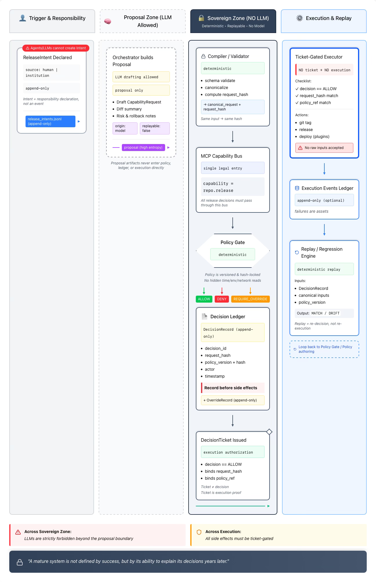Intelligence is allowed only in the Proposal Zone: explanations, drafts, candidate changes may be smart. Once inside the sovereign zone, only deterministic flows are permitted (validate / canonicalize / hash / policy / evidence / write).