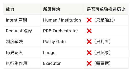 RRB 的唯一使命是把 人类/制度的责任声明(Intent) 翻译成 可审计、可重算、可执行 的结构,并把执行动作严格绑定到 制度产生的票据 上。